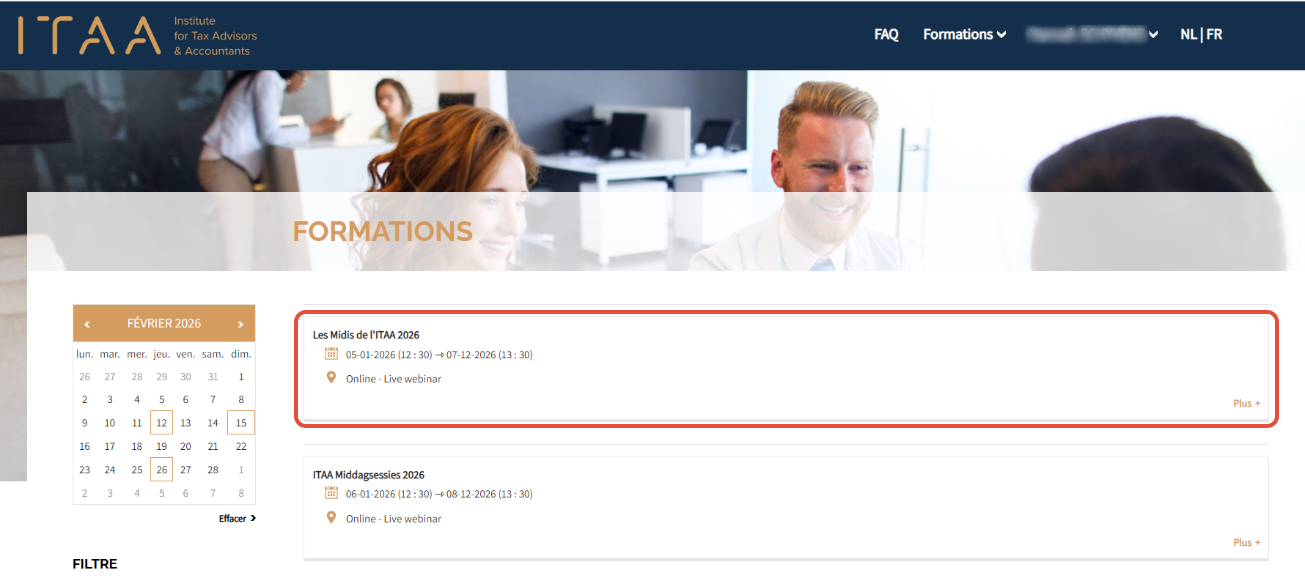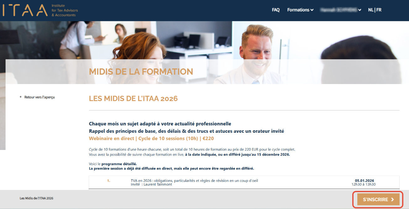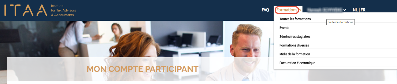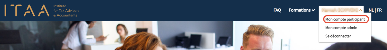 Vous pouvez consulter votre inscription à tout moment dans « Mon compte participant » sur le portail ITAA. Vous y accédez en cliquant sur votre nom en haut à droite. Votre inscription apparaîtra dans la rubrique « Mes inscriptions récentes ».