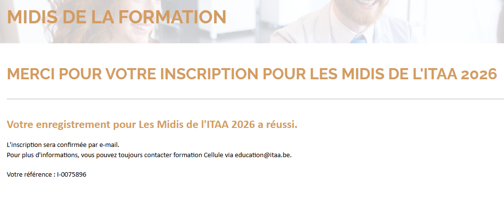 Cliquez sur le bouton « Confirmer » pour finaliser votre inscription. Un message de confirmation apparaîtra à l'écran et vous recevrez automatiquement un e-mail de confirmation (expéditeur: education@itaa.be).