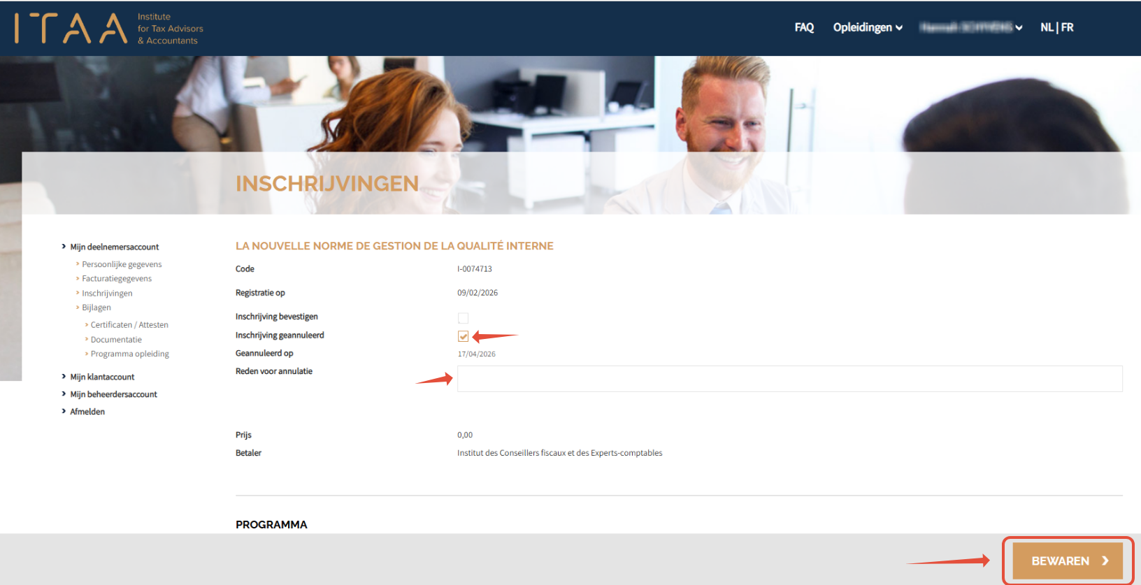 Stap 3: Vink het vakje "annuleren" aan, geef een reden op en klik rechts onderaan op bewaren.