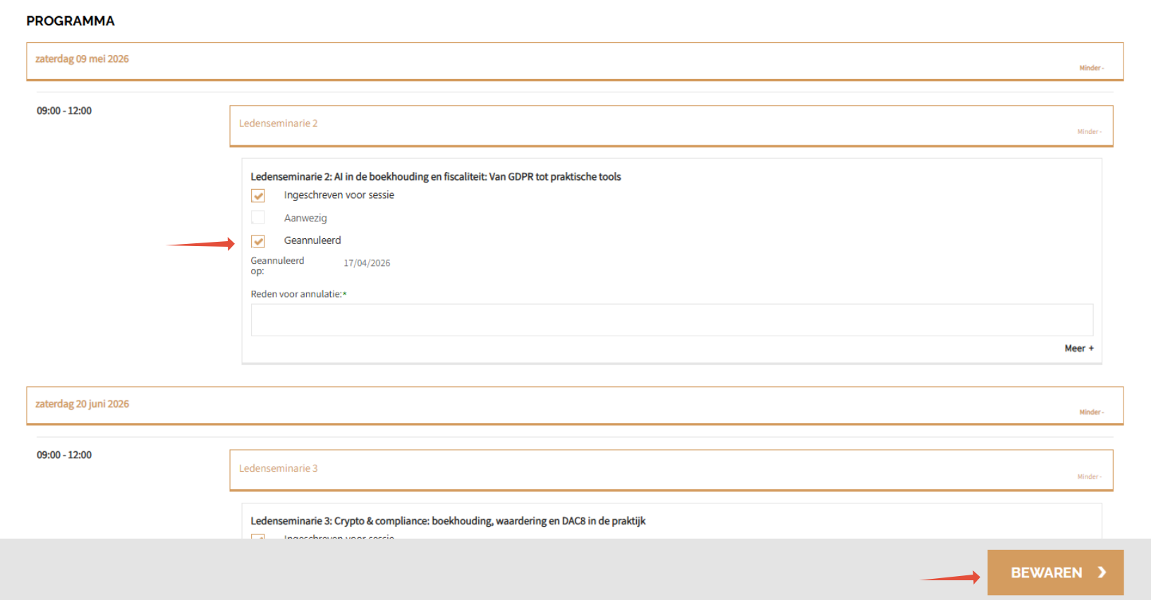 Let op: Bevat uw inschrijving meerdere modules, zoals bijvoorbeeld bij de Ledenseminaries of Middagsessies? Dan scrollt u naar beneden en vinkt u per module/sessie het vinkje aan en klikt u op bewaren.![]()